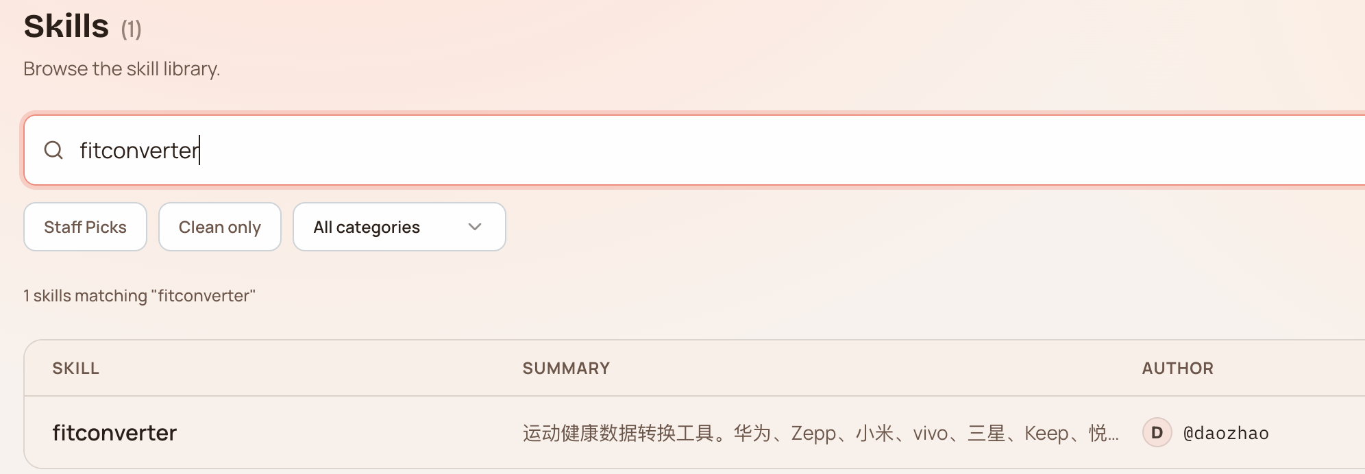 让小龙虾在ClawHub搜索运动健康转换工具官方skill——— fitconverter