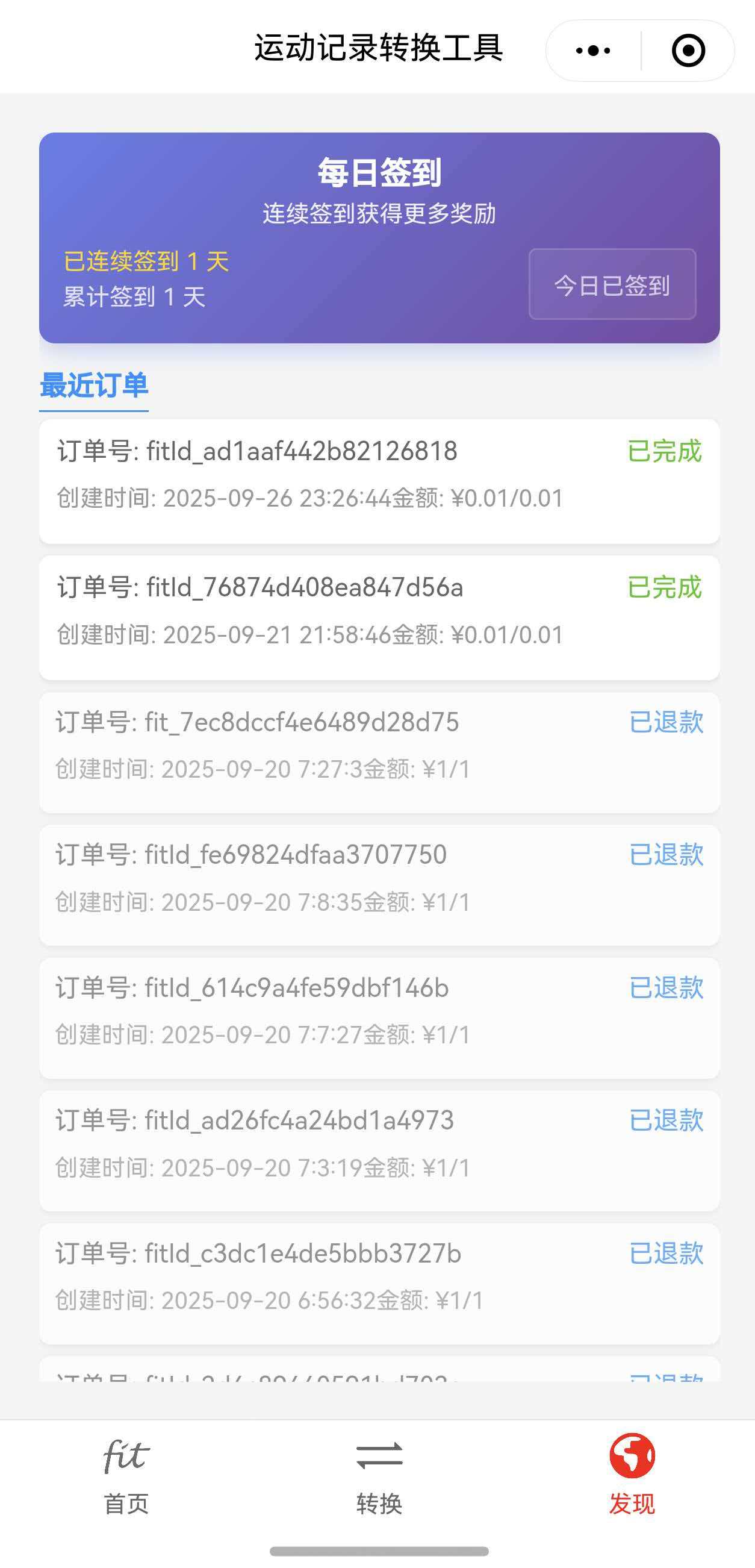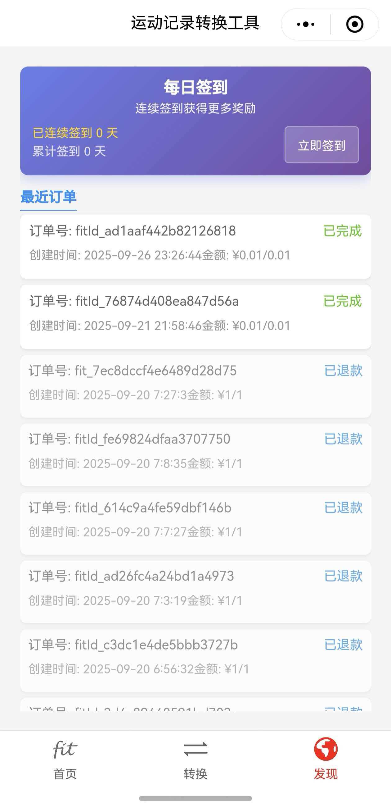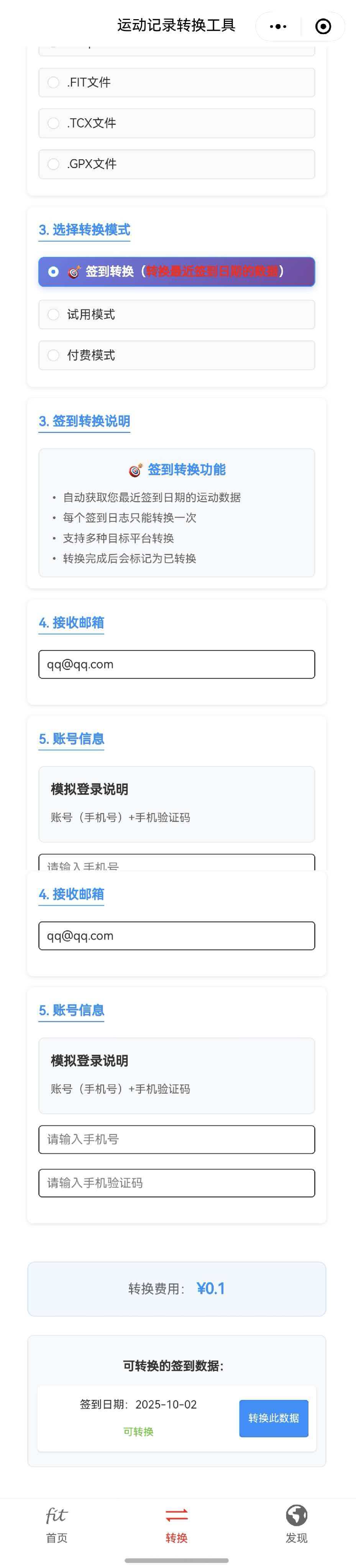 发现有部分跑友可能只是想转换部分日期的数据,目前没有很好的转换模式满足这类需求,为此特定在微信小程序版本开发了签到功能,加入了“签到转换”模式,可以在将签到日当天的数据进行转换,仅需支付费用0.1元即可